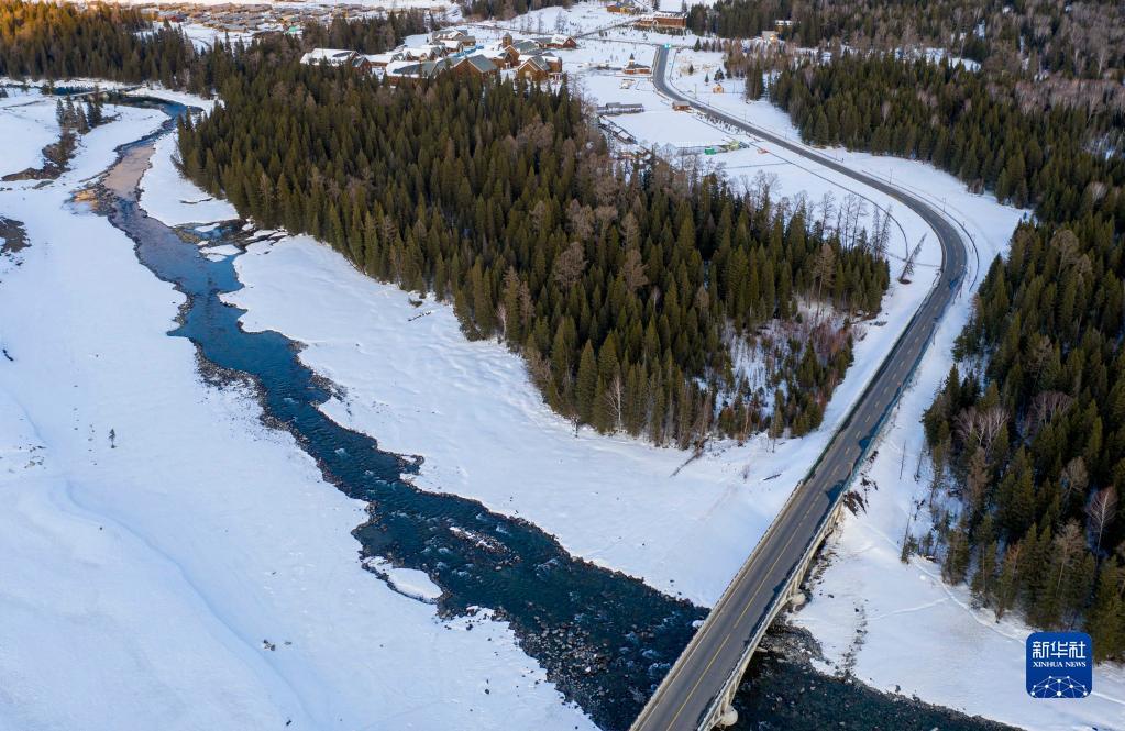 3月28日拍攝的跨過(guò)喀納斯河的G219國道(無(wú)人機照片)。