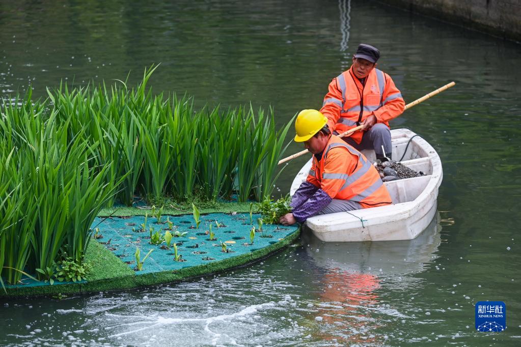 3月29日,龍泉街道工作人員乘船在市陌河里補種水上浮島的水生植物。