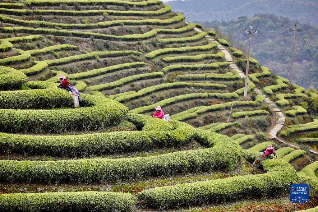 福建省連江縣長(cháng)龍鎮茶農在采摘春茶(3月28日攝)。