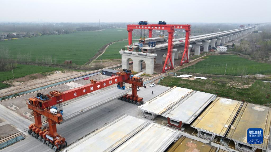 這是3月29日拍攝的中鐵四局巢馬城際鐵路箱梁架設現場(chǎng)(無(wú)人機照片)。
