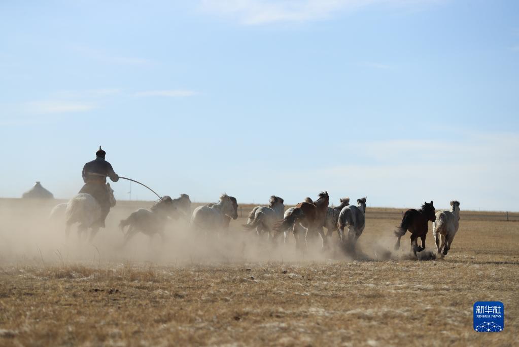 春日到來(lái),內蒙古錫林郭勒盟西烏珠穆沁旗天氣轉暖,當地牧民趕著(zhù)馬匹,來(lái)到草原上馴馬。
