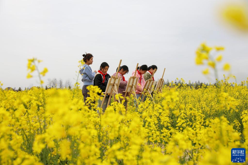 3月29日,學(xué)生在來(lái)安縣大英鎮一生態(tài)農莊內的油菜花海中寫(xiě)生。