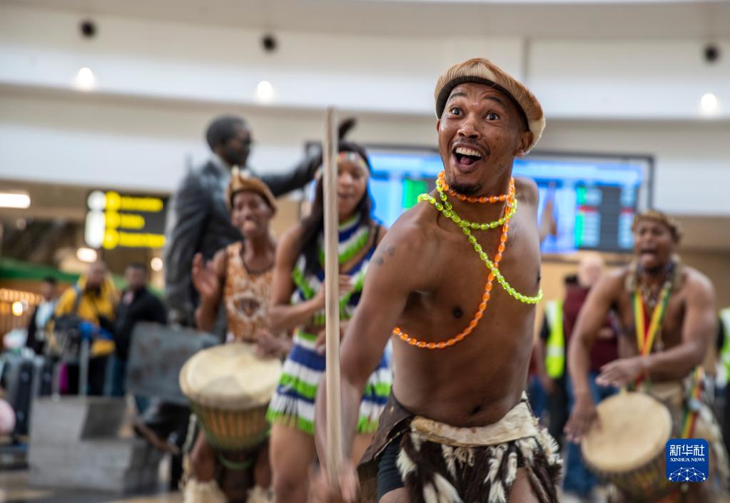 3月29日,在南非約翰內斯堡坦博國際機場(chǎng),舞蹈演員在歡迎中國游客的儀式上表演。