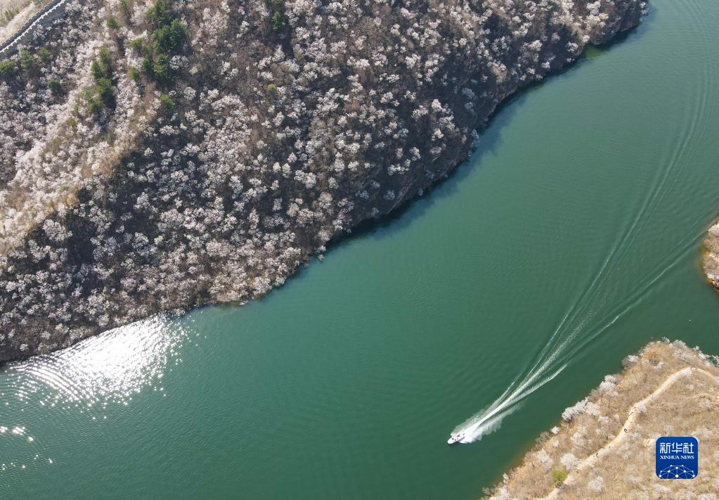 3月29日,游船行駛在黃花城水長(cháng)城腳下(無(wú)人機照片)。