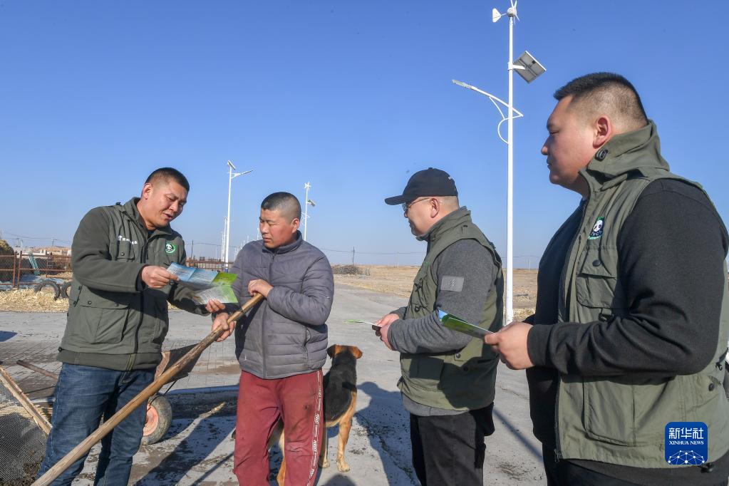 3月28日,在吉林省白城市鎮賚縣,中國野生動(dòng)物保護協(xié)會(huì )吉林白城護飛隊隊員王凱(左一)、姜海濤(右二)和劉聰(右一)向候鳥(niǎo)棲息地附近的農民宣傳野生動(dòng)物保護知識。