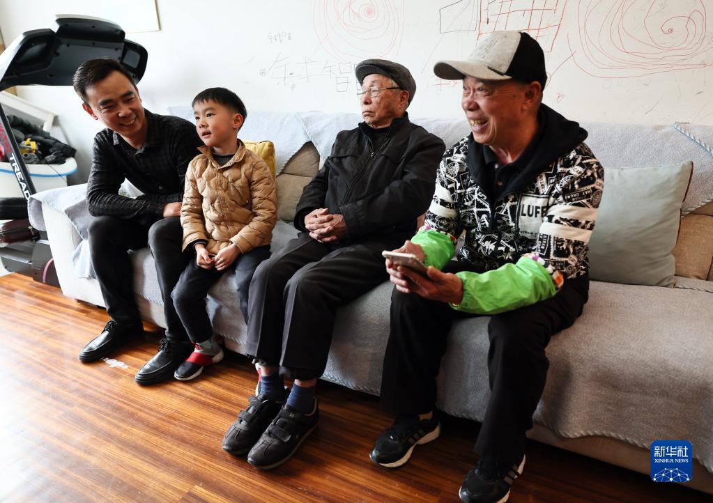 3月29日,錢(qián)?;ㄓ叶?、錢(qián)建平(右一)、錢(qián)鈞(左一)、錢(qián)智臣一家四代人在江蘇無(wú)錫家中。