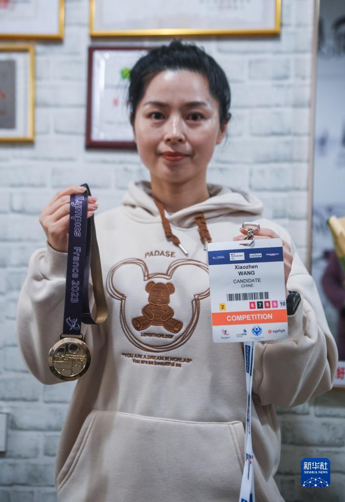 3月30日,在位于杭州市臨平區塘棲鎮的曉珍發(fā)藝工作室內,聾啞人王曉珍展示她參加國際殘疾人職業(yè)技能競賽的參賽證和贏(yíng)得的金牌。