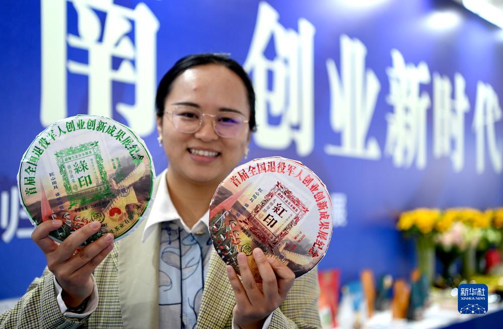 3月30日,首屆全國退役軍人創(chuàng )業(yè)創(chuàng )新成果展交會(huì )現場(chǎng),一名參展人員展示為展會(huì )特制的紀念茶餅。