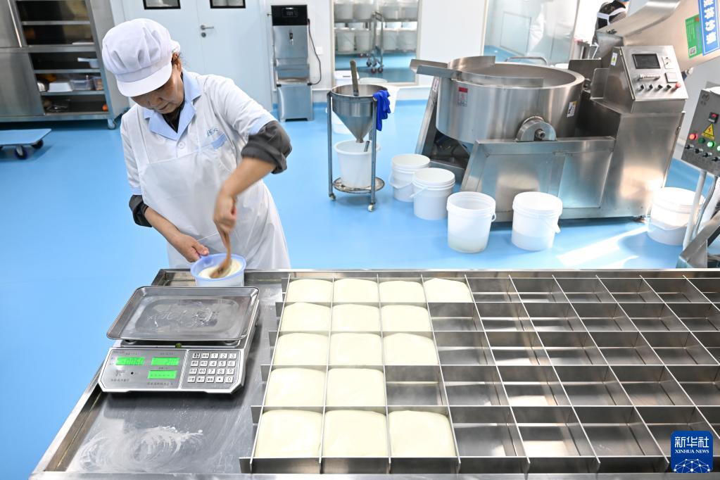 3月31日,在鑲黃旗民族傳統奶制品產(chǎn)業(yè)園的一家奶制品企業(yè)生產(chǎn)車(chē)間,工作人員將融化的奶豆腐裝入模具。
