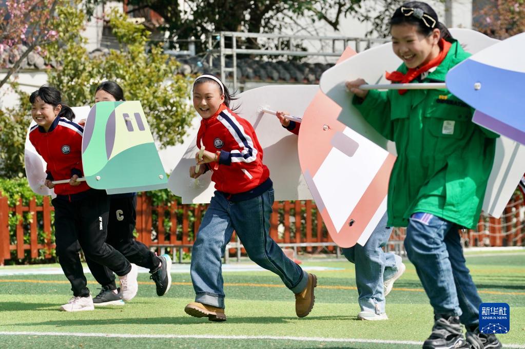 3月31日,徐州市漢橋小學(xué)的學(xué)生進(jìn)行“列車(chē)競速”游戲。