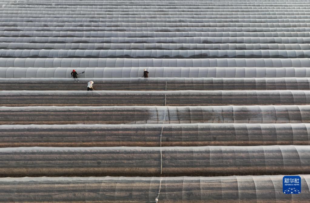 3月30日,唐山市豐潤區新軍屯鎮的農民在田間給生姜棚膜覆土(無(wú)人機照片)。