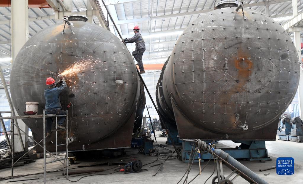 3月29日,山東省新泰市一家重工科技公司的工人在對儲罐進(jìn)行外表面打磨清理。