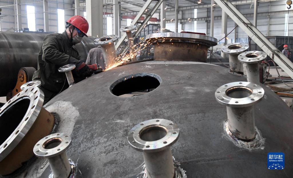 3月29日,山東省新泰市一家重工科技公司的工人在對儲罐進(jìn)行外表面打磨清理。