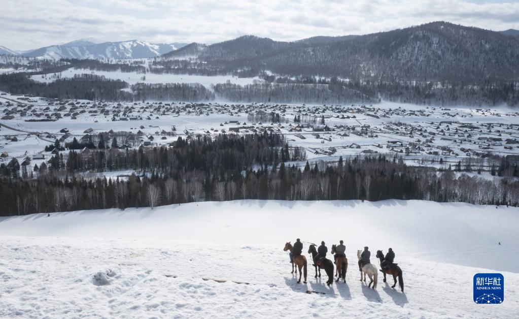 3月30日,蘇卡(中)和馬隊隊員在禾木村后山的觀(guān)景平臺上眺望村落,商議未來(lái)的發(fā)展(無(wú)人機照片)。