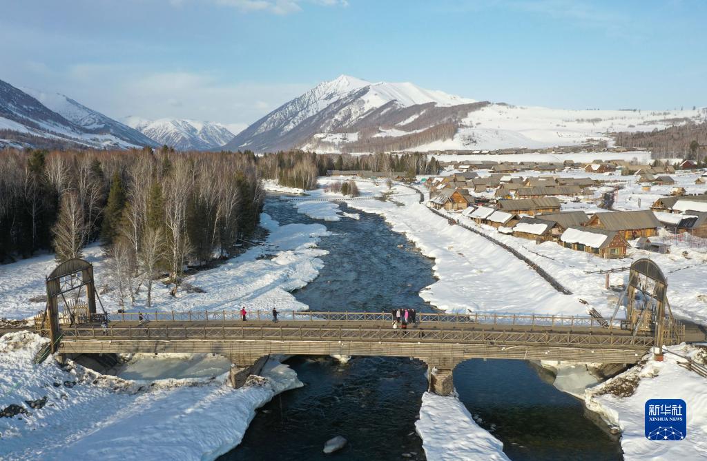 3月29日,游客在禾木村的橋上合影留念(無(wú)人機照片)。