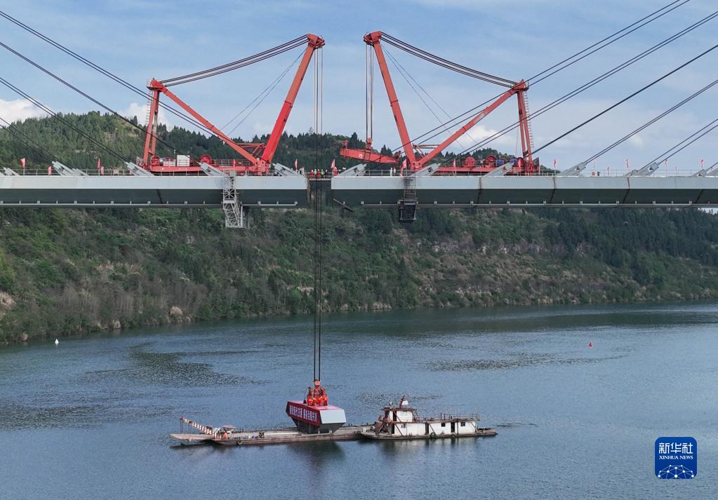 四川路橋的施工設備正在安裝漢巴南鐵路嘉陵江特大橋的最后一節段鋼箱梁(3月30日攝,無(wú)人機照片)。由蜀道集團四川路橋承建、中鐵五院設計漢巴南鐵路嘉陵江特大橋全長(cháng)1770.82米,最高主塔高164.5米,是一座雙線(xiàn)高速鐵路高低塔混合梁斜拉橋。