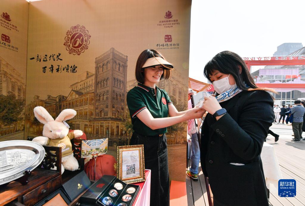 3月31日,在天津海河古文化街親水平臺,游客購買(mǎi)津城老字號品牌的商品。