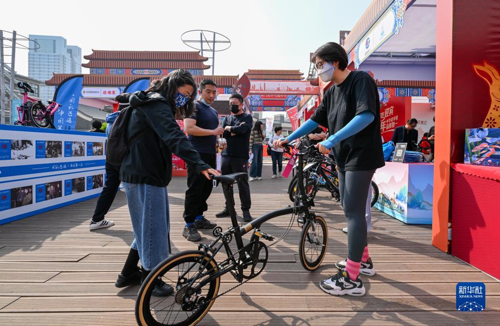 3月31日,在天津海河古文化街親水平臺,游客試騎津城老字號品牌飛鴿牌自行車(chē)。