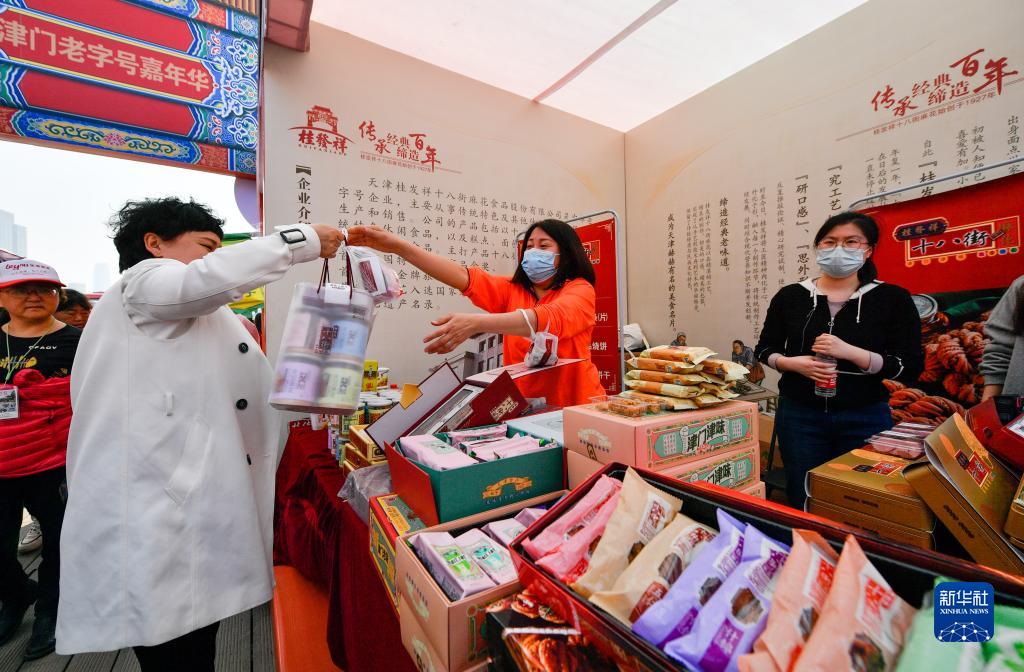 3月31日,在天津海河古文化街親水平臺,游客購買(mǎi)津城老字號品牌桂發(fā)祥的商品。