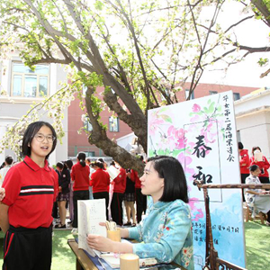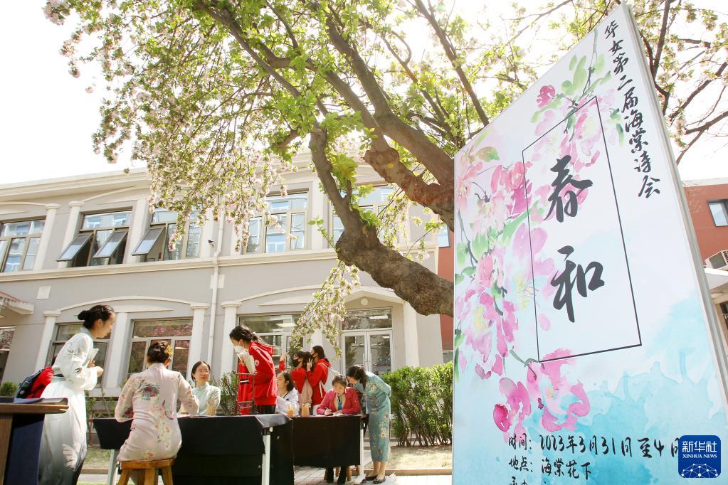 當日,北師大實(shí)驗華夏女子中學(xué)舉辦以“春和”為主題的第二屆“海棠詩(shī)會(huì )”。師生們選取有關(guān)“春天”“和煦”“生機”“美好”的詩(shī)歌,在校園的海棠樹(shù)下賞析吟誦,共享詩(shī)歌之美,傳承中華優(yōu)秀傳統文化。