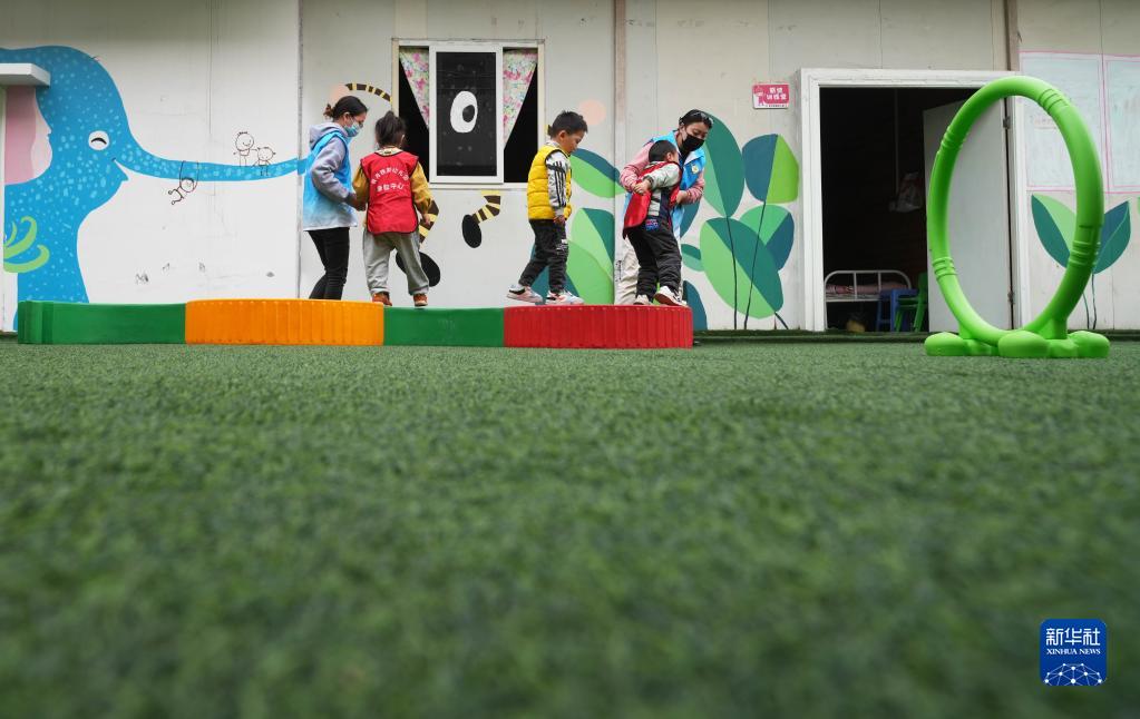 3月31日,在重慶市北碚區奔月鐵路幼兒園康教中心,特教老師幫助孤獨癥兒童進(jìn)行感統訓練。