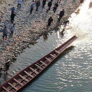 4月1日,景洪市勐罕鎮曼聽(tīng)村村民推送龍舟進(jìn)入瀾滄江(無(wú)人機照片)。