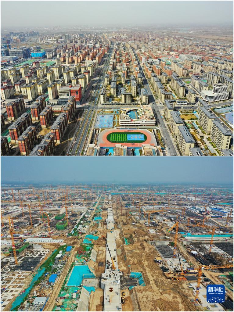 拼版照片:上圖為2023年3月24日拍攝的雄安新區容東片區(無(wú)人機照片);下圖為2020年8月11日拍攝的雄安新區容東片區建設現場(chǎng)(無(wú)人機照片)。