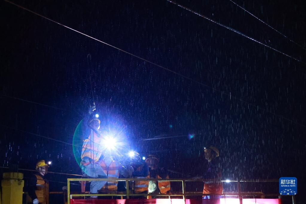 4月1日,工作人員乘坐架線(xiàn)車(chē)對接觸網(wǎng)導線(xiàn)進(jìn)行架設。