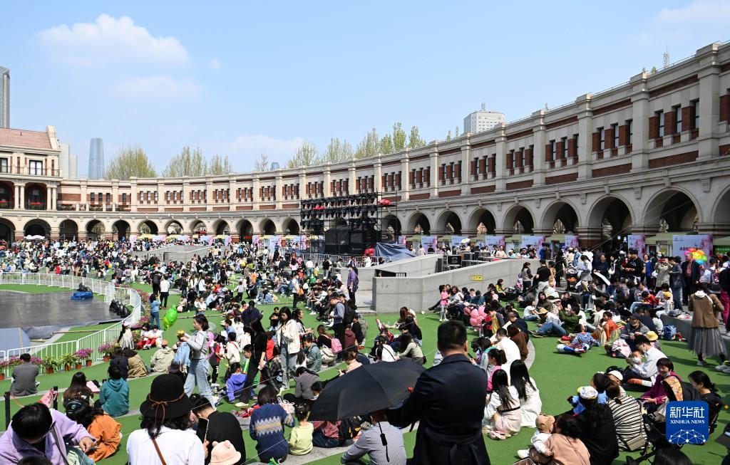4月1日,游客在位于天津市五大道風(fēng)景區的民園廣場(chǎng)內休閑游覽。