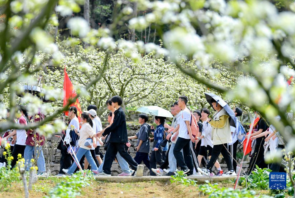 3月31日,宣恩縣第一中學(xué)的學(xué)生在梨園里開(kāi)展研學(xué)活動(dòng)。