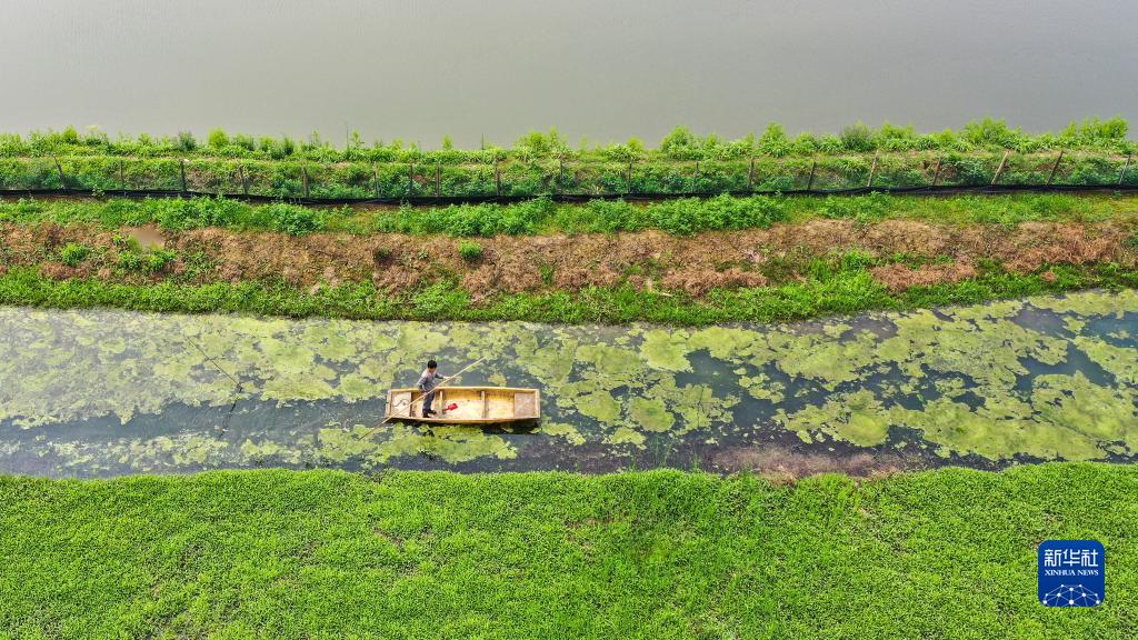 4月1日,村民在常寧市板橋鎮南洋村“稻蝦共養”生態(tài)農業(yè)基地里巡查(無(wú)人機照片)。