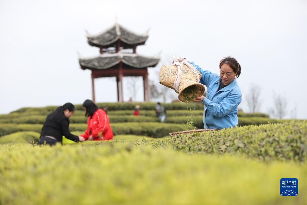 4月1日,村民在岑鞏縣天馬鎮一茶葉種植基地采摘明前茶。