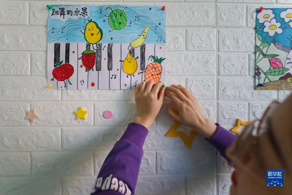 3月31日,特教老師陳進(jìn)把孤獨癥兒童的繪畫(huà)作品釘在墻上。