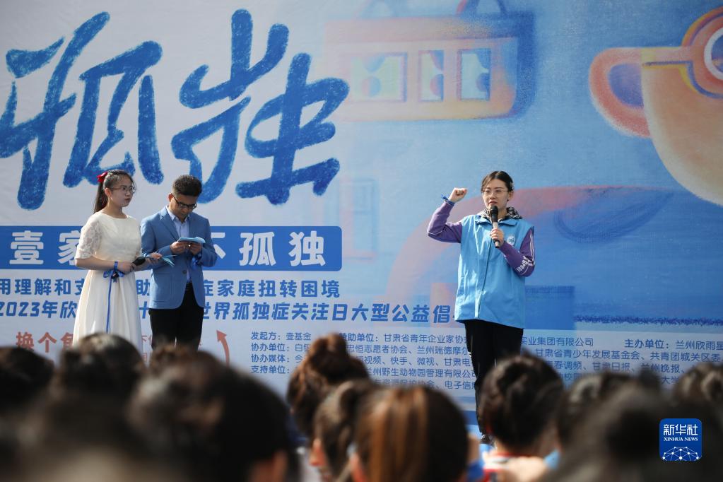4月1日,特教老師陳進(jìn)(右)在蘭州一孤獨癥日公益活動(dòng)上帶領(lǐng)志愿者們宣誓。