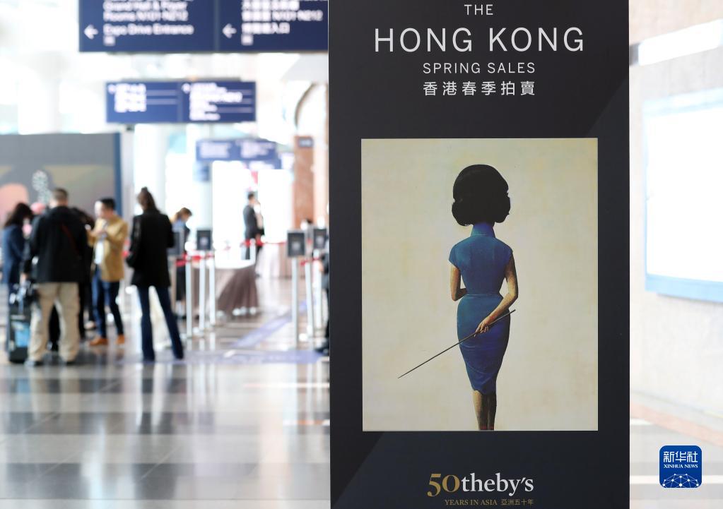 這是4月1日在香港會(huì )議展覽中心拍攝的蘇富比2023年春拍宣傳牌。