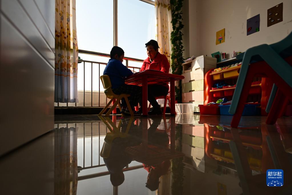 3月30日,在青海省西寧市星光特殊兒童服務(wù)中心,陳志芳(右)給孤獨癥兒童做認知訓練。
