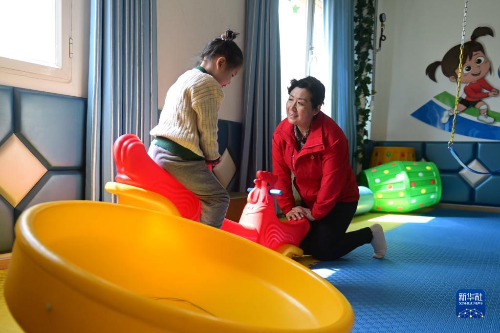 3月30日,在青海省西寧市星光特殊兒童服務(wù)中心,陳志芳(右)給孤獨癥兒童做運動(dòng)訓練。