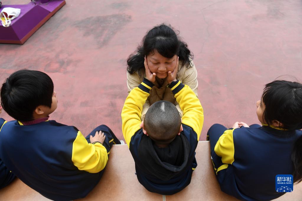 在廣西南寧高新區龍華學(xué)校,何冬艷和孤獨癥學(xué)生在一起(3月31日攝)。