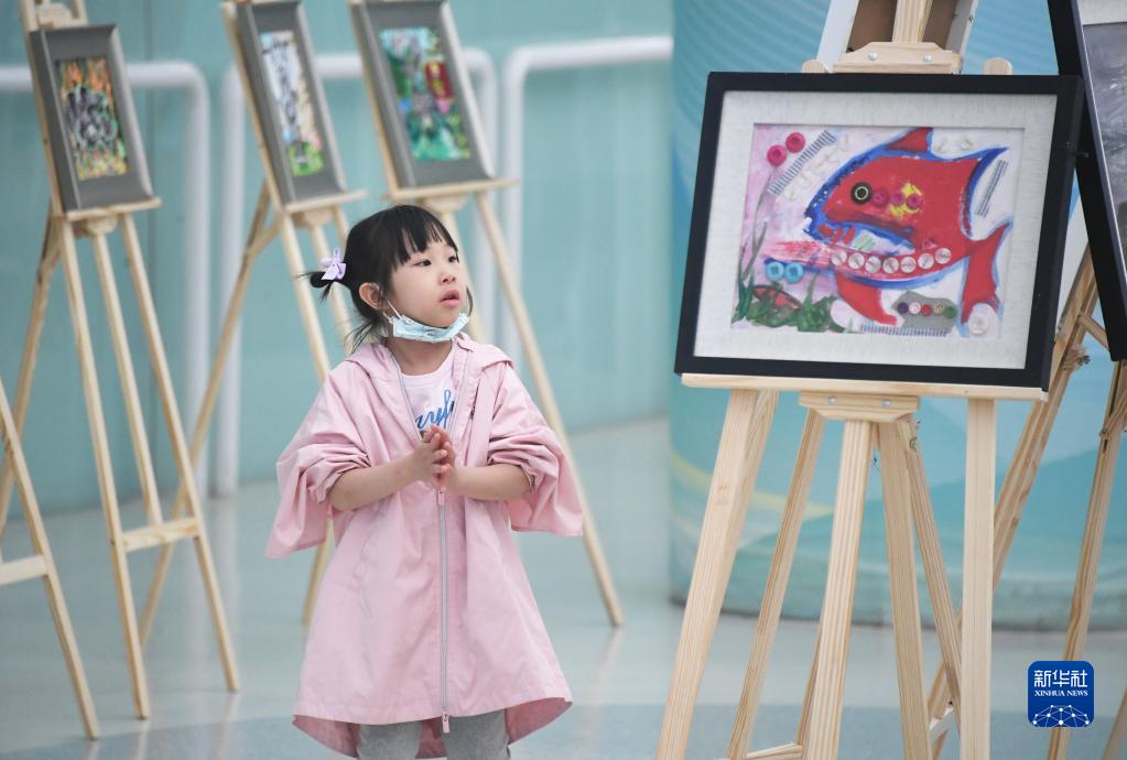 4月2日,一名小朋友在國家游泳中心“水立方”參觀(guān)融合兒童畫(huà)展。