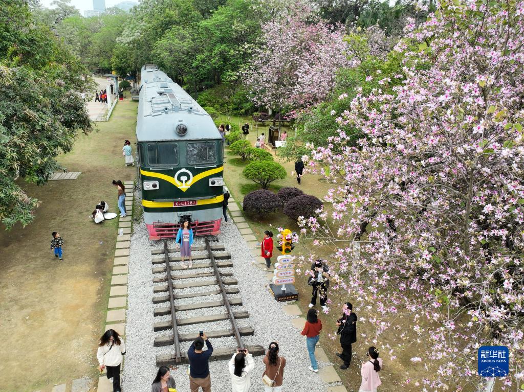 4月1日,在廣西柳州市工業(yè)博物館,市民在花下游玩(無(wú)人機照片)。