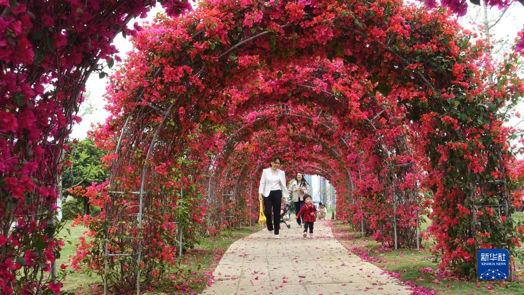 4月2日,游人在廣西賀州市愛(ài)蓮湖公園踏春游玩。