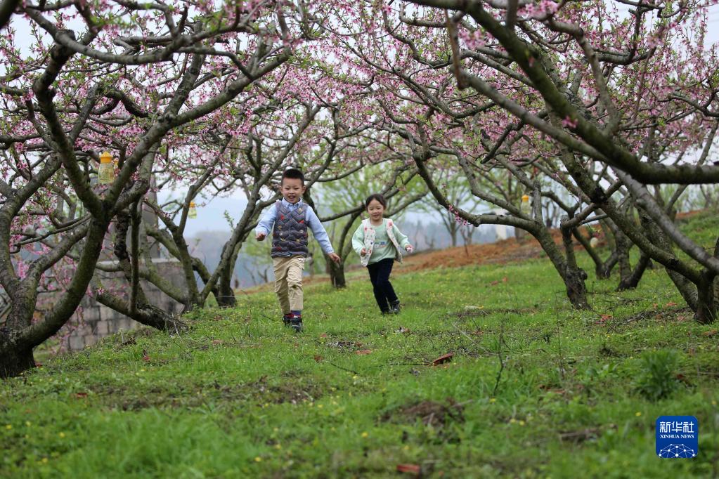 4月2日,在貴州省銅仁市玉屏侗族自治縣皂角坪街道甕陽(yáng)村,小朋友在花間奔跑。