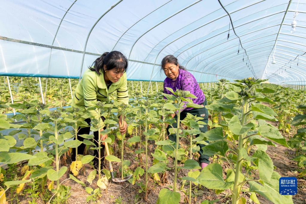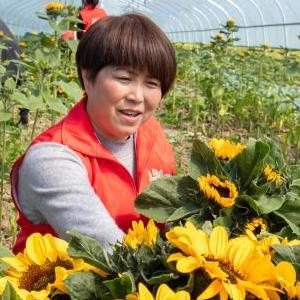4月2日,在江蘇省海安市大公鎮仲洋村向日葵種植基地,農民采割向日葵花。