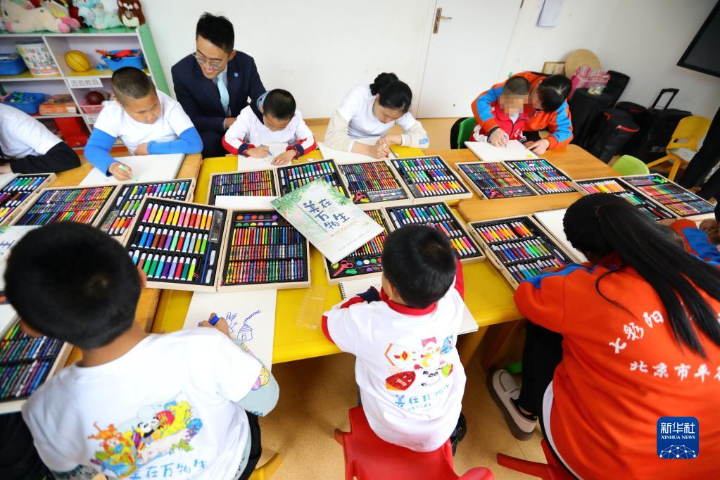 4月2日,在關(guān)注“星星的孩子”公益捐助活動(dòng)上,工作人員跟孩子們一起畫(huà)畫(huà)。