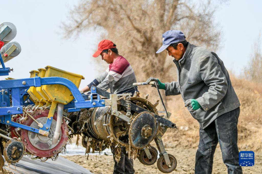 在新疆尉犁縣,棉農在調試播種機(3月30日攝)。