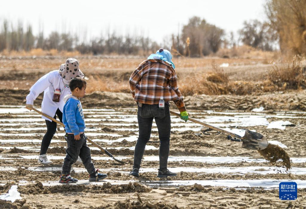 在新疆尉犁縣,棉農在地膜上補土(3月30日攝)。