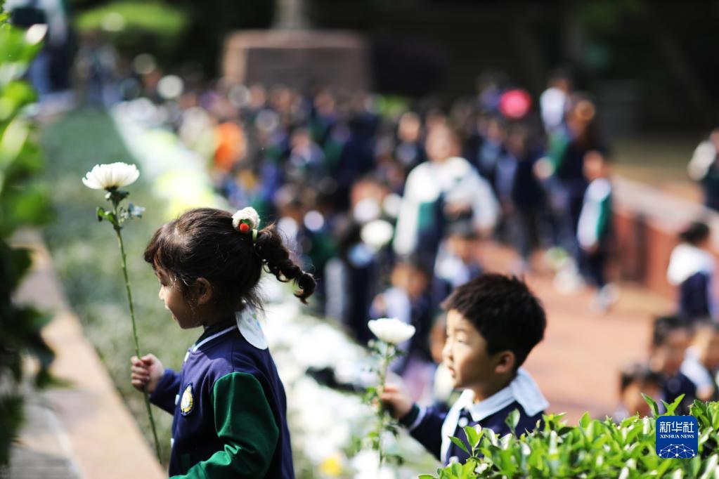4月3日,在貴州省赤水市紅軍烈士陵園,赤水市階梯幼兒園小朋友排隊向紅軍烈士敬獻鮮花。