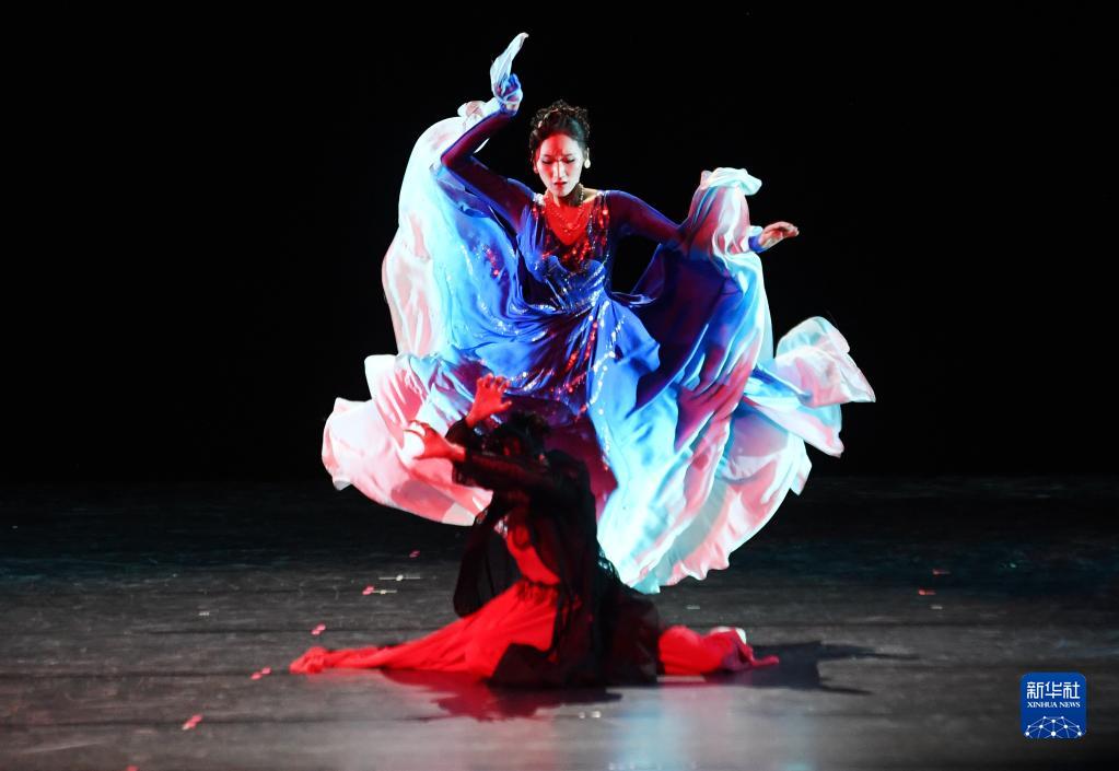 4月3日,演員在舞劇《藍色裙擺》中表演。