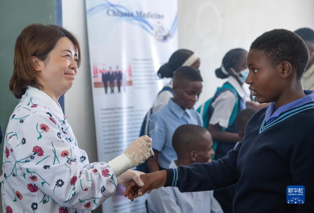 4月3日,在納米比亞溫得和克的伊曼紐爾·謝菲迪中學(xué)課堂上,一名學(xué)生體驗艾灸。