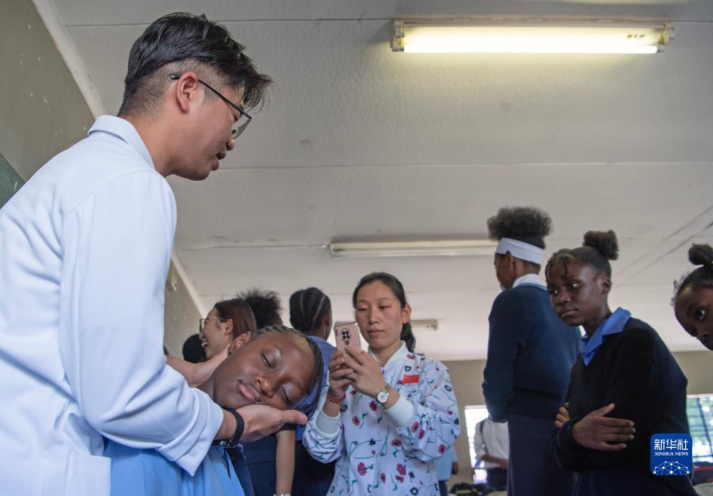 4月3日,在納米比亞溫得和克的伊曼紐爾·謝菲迪中學(xué)課堂上,一名學(xué)生體驗推拿。
